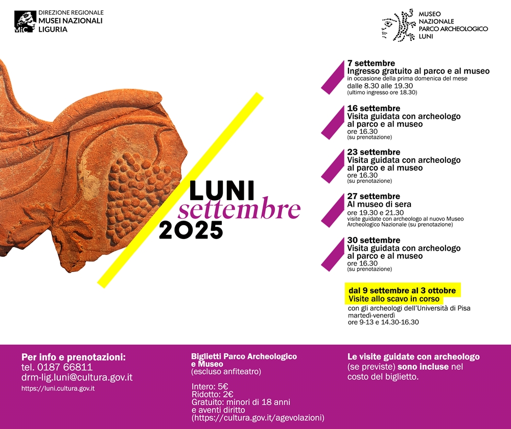 Per visitare il Museo e il Parco archeologico è consigliata la prenotazione per i gruppi inviando una richiesta via email drm-lig.luni@cultura.gov.it